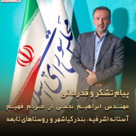 بار دیگر سپاس ویژه خود را به همهی هم استانیهای عزیز، بخصوص مردم شریف حوزه انتخابیه آستانهاشرفیه و بندرکیاشهر و روستاهای تابعه که با اعتماد مجدد، بار دیگر این فرزندشان را به وکالت مجلس شورای اسلامی برگزیدهاند، تقدیم میدارم.